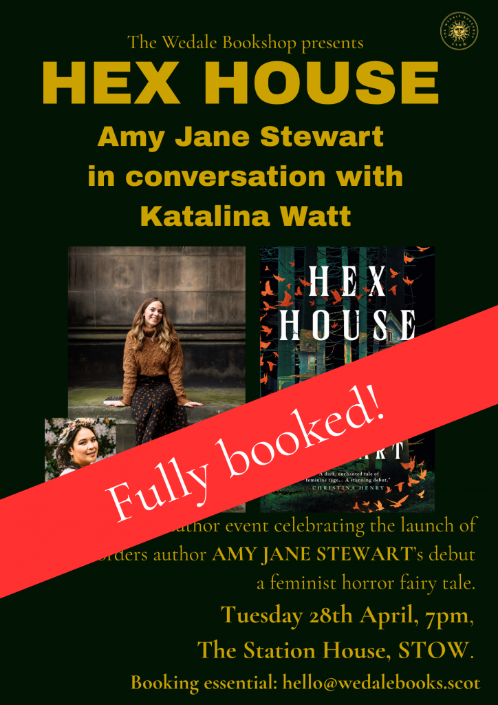 We are delighted to welcome Borders-based writer Amy Jane Stewart to Stow for the launch of her debut novel, Hex House. A feverishly told, dark and unsettling Scotland-set fairy-tale about a safe haven for women which transforms them into vessels of revenge.
